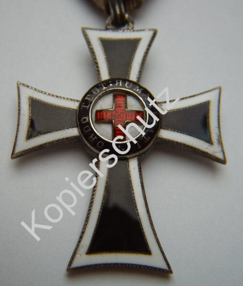 Am Avers befindet sich die Aufschrift Ordo Teut(onicus) was soviel wie Deutscher Ritterorden bedeutet. Das Humanitati ist wohl selbsterklärend und soll den wolltätigenden Charakter des Ordens zum Ausdruck bringen. Das schwarze Kreuz auf weißem Grund ist Symbol des Sieges Christi über die Mächte der Dunkelheit und des Todes.