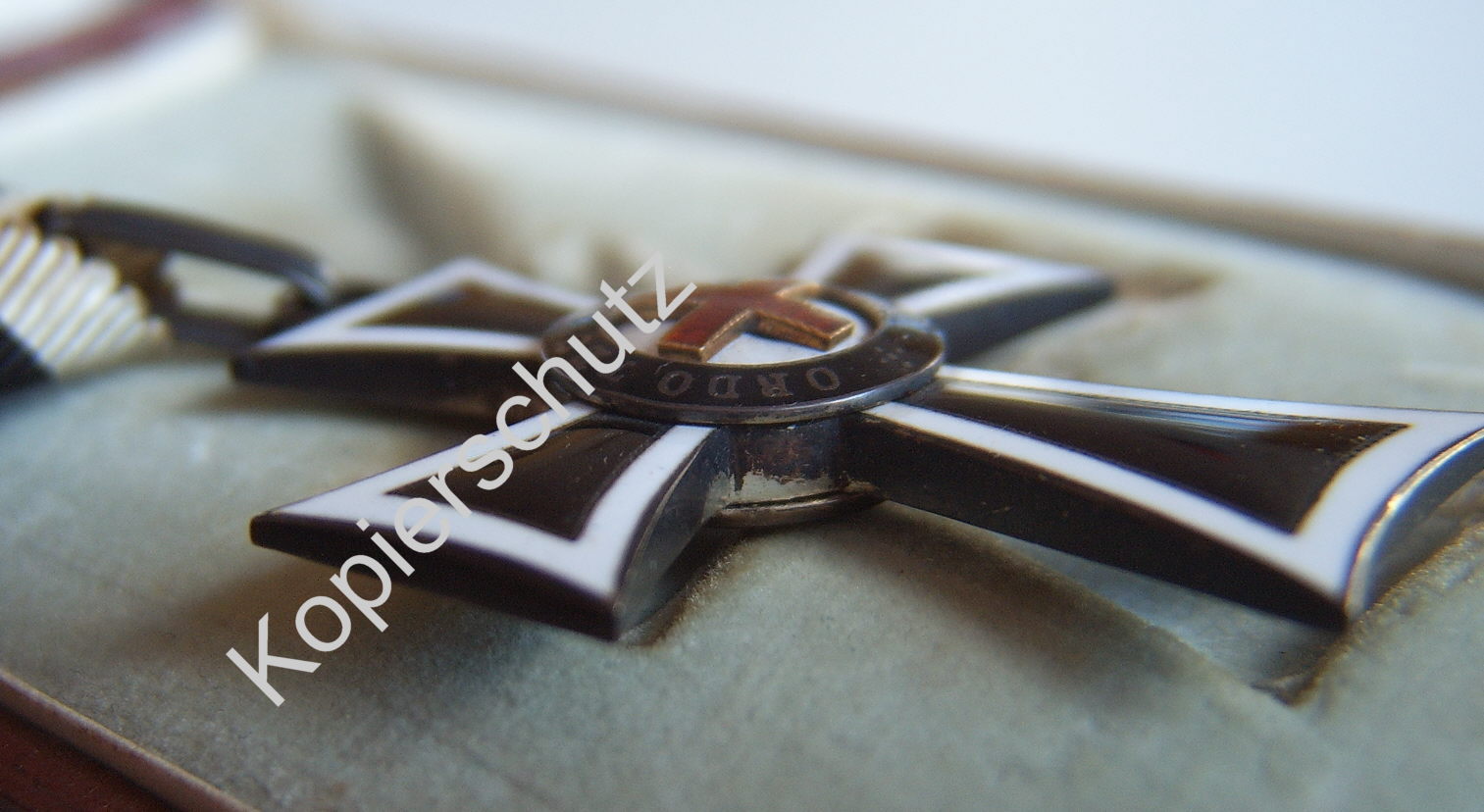 Auf den folgenden Bildern auch noch ein Marinanerkreuz im Originalen Etui des Herstellers Mayer & Söhne, Wien. Das Kreuz hat im Bandring die Punzierung A (Kontrollamtszeichen für Wien) und auf der Ringöse eine für mich undefinierbare.